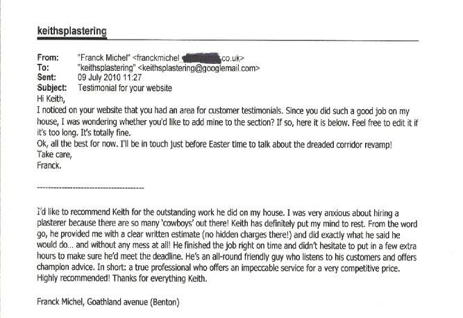 I was very anxious about hiring a Plasterer because there so many ‘cowboys’ out there! Keith has definitely put my mind to rest. From the word go, he provided me with a clear written estimate (no hidden charges there) and did exactly what he said he would do… and without any mess at all! He finished the job right on time and didn’t hesitate to put in a few extra hours to make sure he’d meet the deadline. He’s an all-round friendly guy who listens to his customers and offers champion advice. In short: a true professional who offers an impeccable service for a very competitive price. Highly recommended!